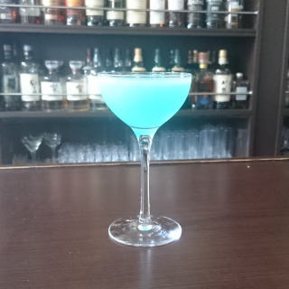 ブルースベリー15mlとグレープフルーツジュース45mlとブルーキュラソー1tspをシェイクして、カクテルグラスに注ぐ。