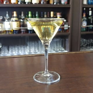 ジン50mlとラフロイグ10mlをステアして、カクテルグラスに注ぐ。