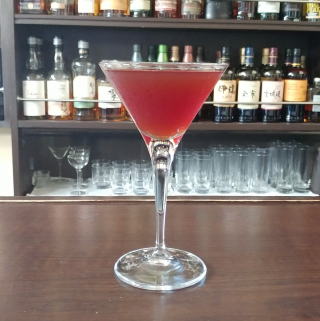 ウオッカ30mlとチェリーブランデー20mlとコアントロー10mlとアンゴスチュラビターズ1dashをステアして、カクテルグラスに注ぐ。