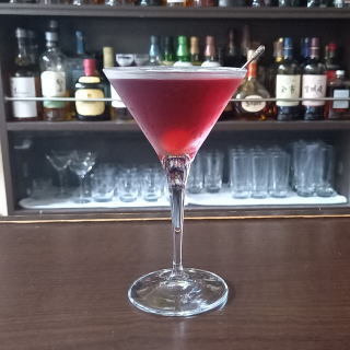 ウオッカ55mlとカシス5mlをステアして、カクテルグラスに注ぎ、マラスキーノチェリーをピンに刺して飾る。