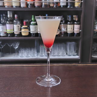 グレナデンシロップ以外の材料をシェイクして、カクテルグラスに注ぎ、グレナデンシロップを沈める。