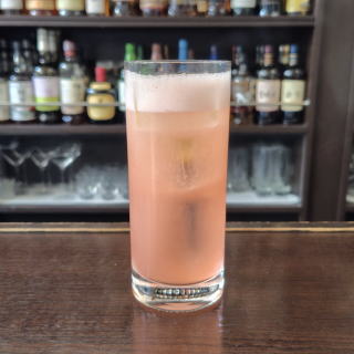 ソーダ以外の材料をシェイクして、氷を入れた12オンスタンブラーに注ぎ、ソーダで割り、レモンスライスを飾る。
