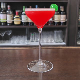 材料をシェイクして、カクテルグラスに注ぎ、ミントチェリーをグラスの縁に飾る。